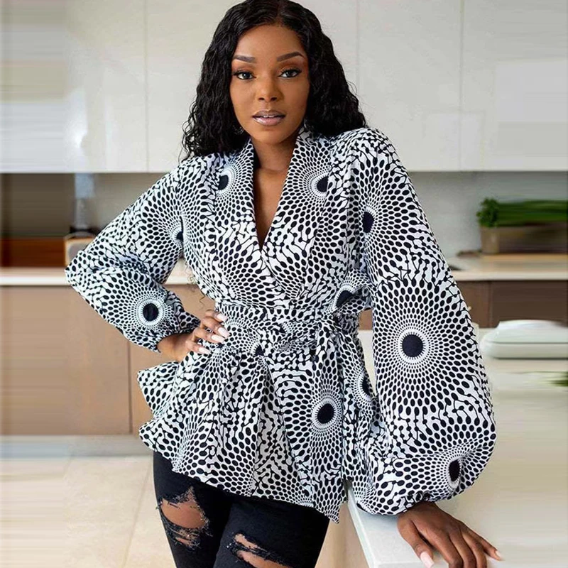African Clothes for Women Summer African Women V-neck Polyester Printing Long Sleeve T-shirt Women Top African Clothing