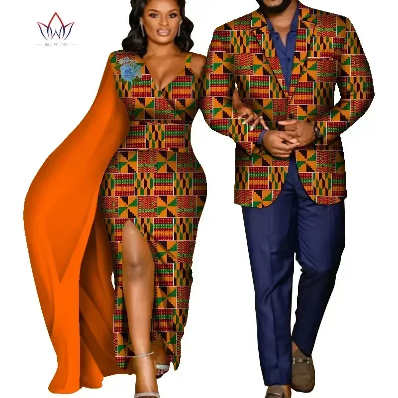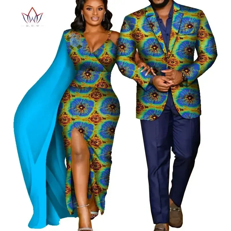 Bintarealwax African Print Clothes for Couple Dashiki Elegant Women Party Dresses Plus Size Men Jacket African Clothing